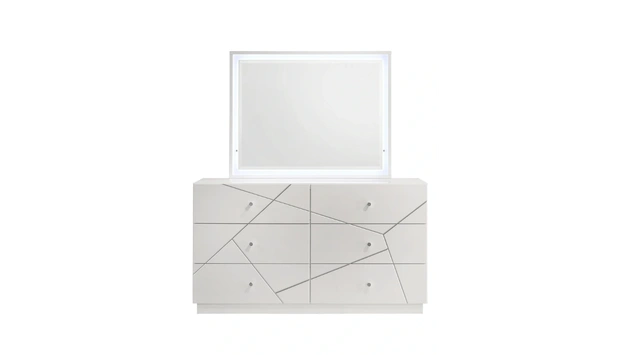 The Grace Paragon Dresser is the perfect blend of function and modern design. With a clean white finish and sleek geometric details, it adds a stylish edge to your space while keeping your clothes and essentials neatly stored.