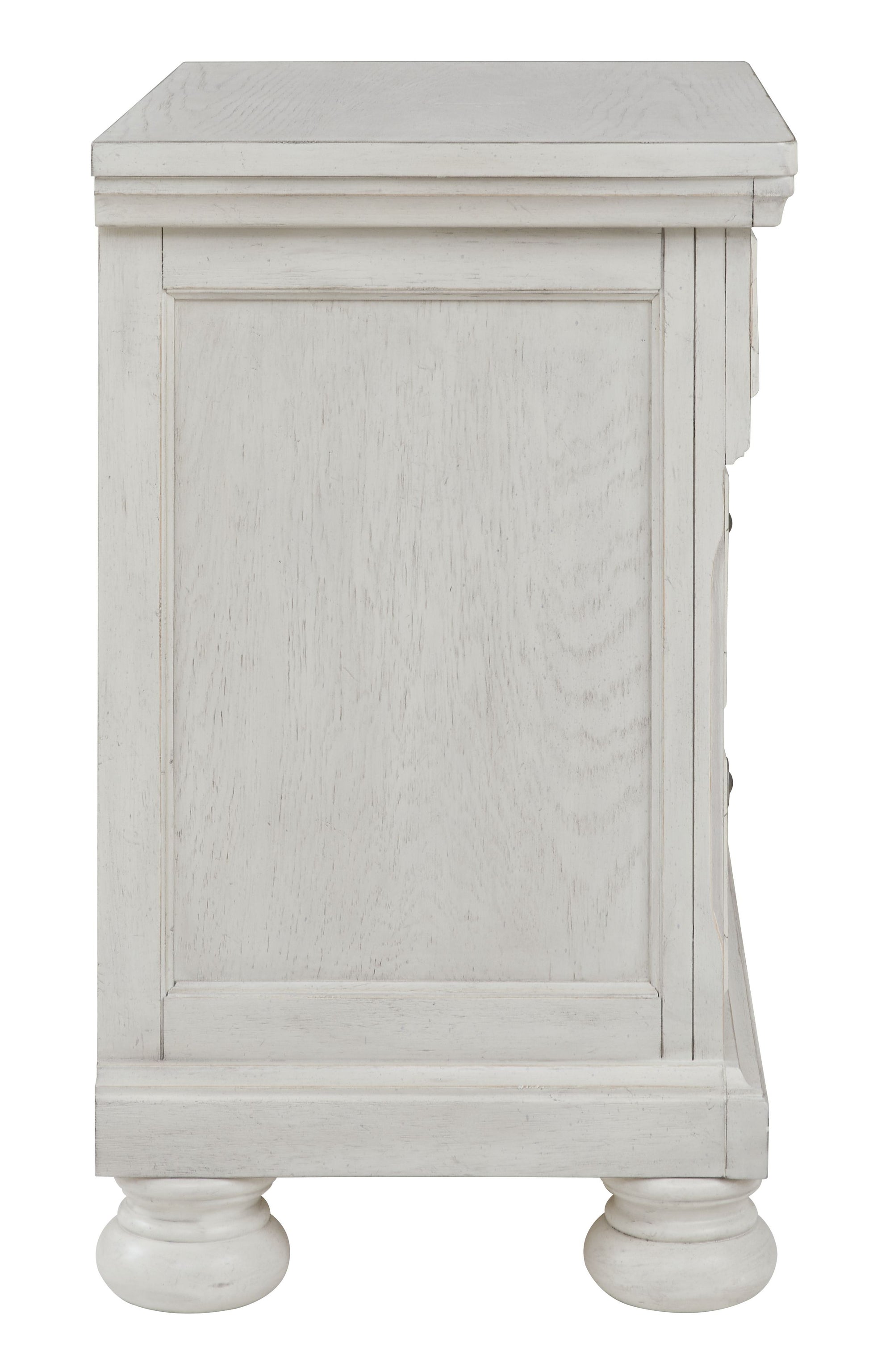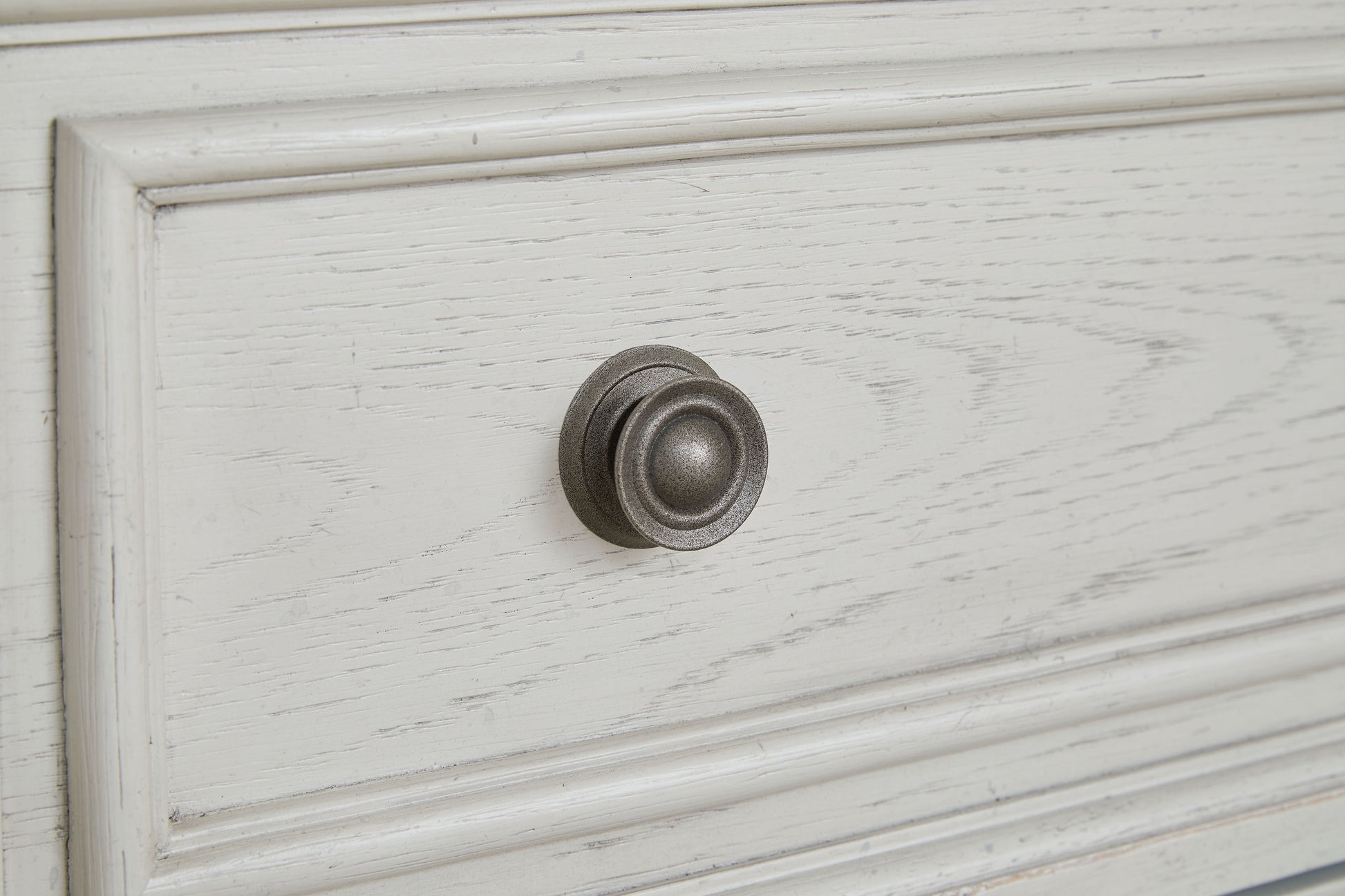 - Antiqued white finish with grain texture