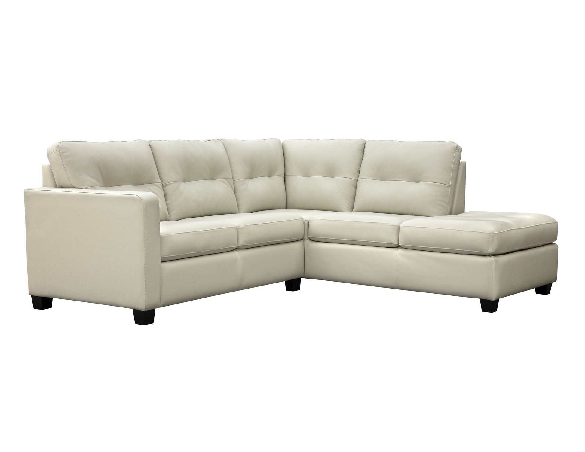 The Serafina sectional is proudly Made in Canada, form El-ran Furniture. Its available in multiple custom leather colours, while also stocked in a beige leather as shown. The set uses 2.2 lb density foam which is pre-crushed so that you have a consistent seating comfort right from day 1. The chaise is available on either the left or the right side.