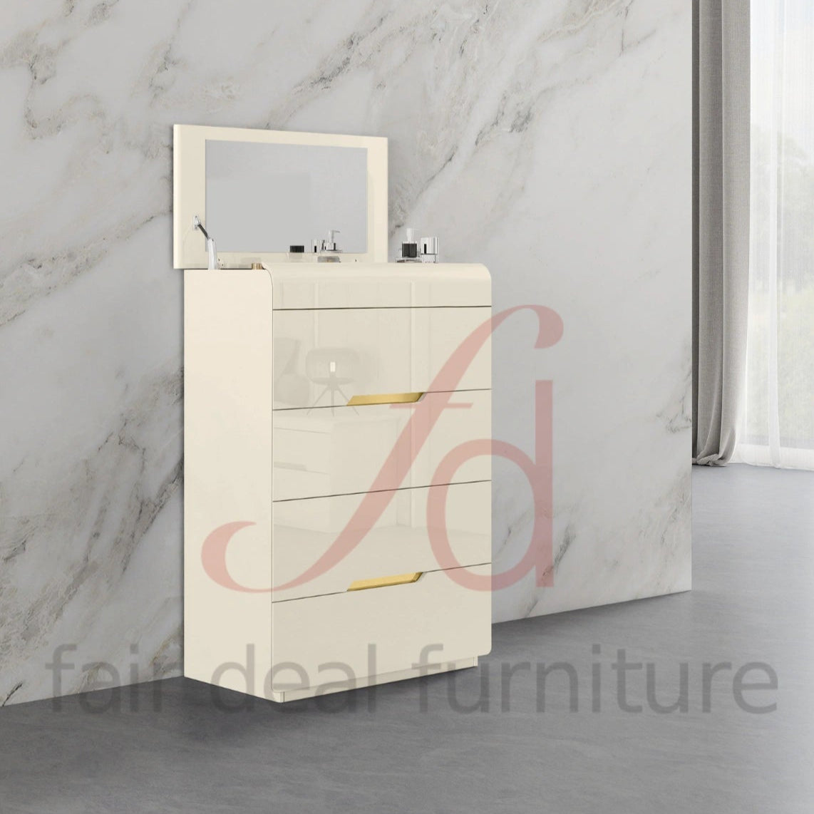 Tall and functional, the Zoe Chest provides ample storage in a compact design. Its glossy beige finish with gold details makes it a standout piece while keeping your room organized.